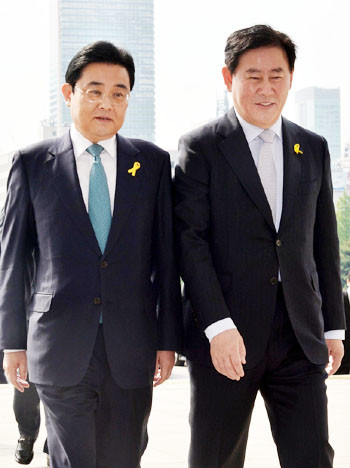 임기 마무리를 앞둔 새누리당 최경환(오른쪽) 원내대표와 새정치민주연합 전병헌 원내대표가 7일 오전 서울 여의도 국회 본청 앞에서 진행된 故 박준규 전 국회의장 노제를 마친 뒤 함께 이동하고 있다.