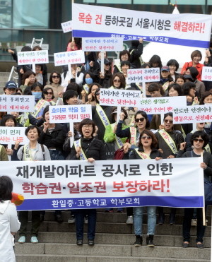 환일고등학교 학부모회 회원들이 8일 오전 서울시 용산구 서울역 광장에서 열린 학교 통학로 인근 재개발 공사를 반대하는 집회에서 구호를 외치고 있다.