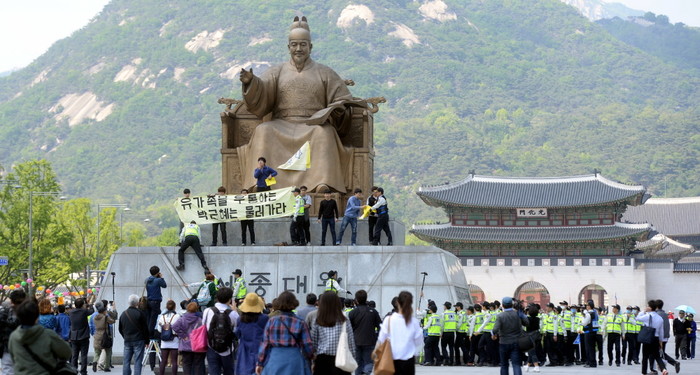 8일 오후 서울 종로구 세종로 광화문광장에서 감리교신학대학교 도시빈민선교회 등 대학생들이 세종대왕동상에 올라가 "박근혜 대통령은 특검 등 세월호 유가족들의 요구안을 전면 수용하고 퇴진하라"며 외치자 경찰들이 올라가 제지하고 있다.