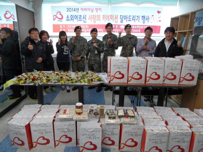 경기 포천시 무한돌봄 북부희망복지센터는 지난 8일 어버이날을 맞이해 홀로 있거나 거동 불편으로 외출이 힘든 저소득층 노인을 대상으로 '2014년 소외 어르신 사랑의 카네이션 달아드리기 행사'를 진행했다. 이번 행사는 네이버 해피빈을 통한 온라인 모금과 영중농협, 영해자동차공업차, 성공회 포천 나눔의집의 후원, 육군 제7759부대 군장병 4명의 자원봉사 참여로 진행됐다. (사진=포천시청)
