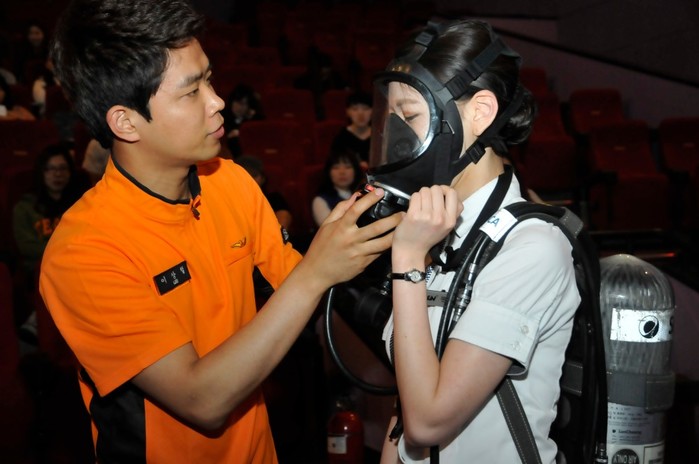 12일 서울 구로소방서는 구로중앙로 AK플라자 8층 ‘CGV구로점’ 5관에서 극장직원들을 대상으로 ▲서울시 화재발생 분석결과 ▲부주의로 인한 화재발생 추이 및 예방요령 ▲건물에 갇혔을 경우 올바른 대처요령 ▲소화기 및 옥내소화전 관리방법 및 사용법 ▲공기호흡기 관리방법 및 사용법 ▲연기발생 시 올바른 대피방법 ▲연기 소화기를 활용한 초기화재 진압방법 등의 찾아가는 화재예방 안전교육을 실시했다. (사진제공=구로소방서)