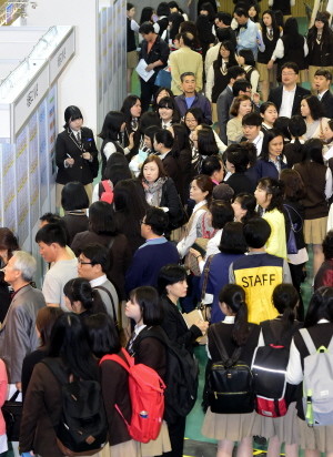 13일 오전 경기 수원실내체육관에서 열린 '2014 수원시 상반기 일자리 박람회'에서 구직자들이 자신에게 맞는 일자리를 찾고 있다.