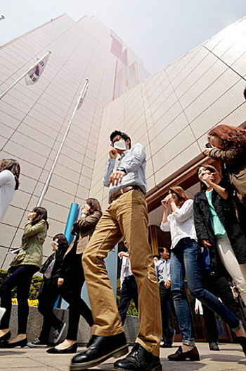 13일 오전 서울 강남구 영동대로 무역센터 트레이드 타워에서 ‘고층건물 화재 대피훈련’이 발령된 가운데 건물에 있던 입주자들이 손수건으로 코와 입을 가리고 대피하고 있다.