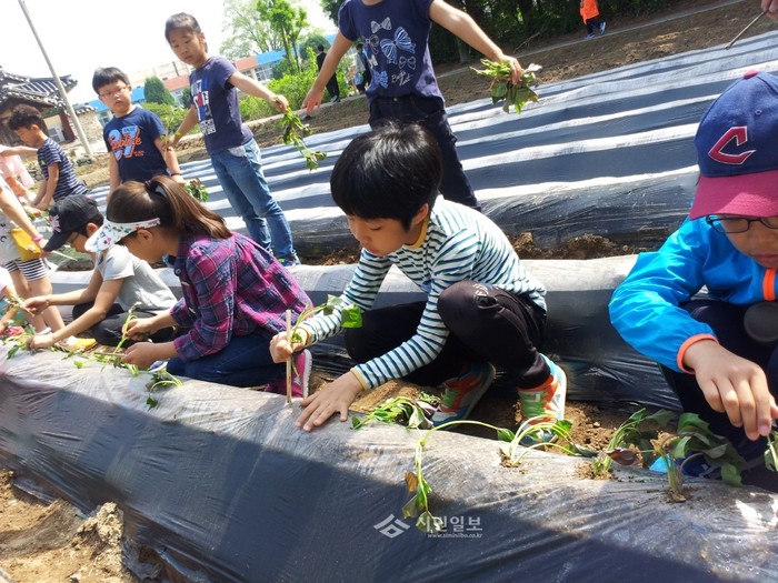 충남 아산 신창초등학교는 지난 13일 1~3학년을 대상으로 창의성 증진과 생명존중 및 감수성 향상을 위해 생태학습 체험활동의 일환으로 '텃밭 가꾸기' 활동인 모종심기를 진행했다. 사진은 이날 '텃밭 가꾸기'에 참여한 학생들이 고구마 순을 심는 모습. (사진제공=아산교육지원청)
