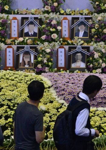 스승의 날을 하루 앞둔 14일 오후 경기 안산시 정부합동분향소에서 희생자 교사들의 영정 앞을 학생들이 지나고 있다.