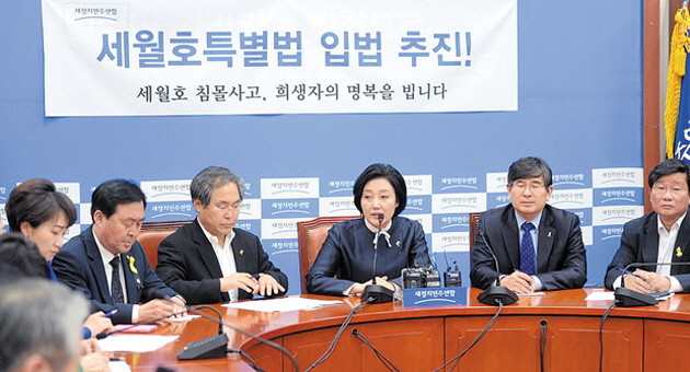 14일 오후 세월호 특별법 준비위원회 1차회의가 열린 서울 여의도 국회 새정치민주연합 원내대표실에서 박영선 원내대표가 인사말을 하고 있다.