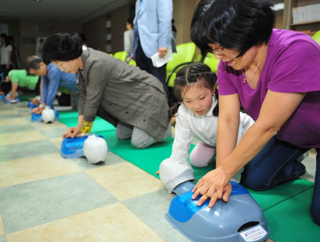 지난 14일 오후 서울 송파구 보건소에서 지역 주민들을 대상으로 응급처치의 첫단계인 심폐소생술의 이론과 체험을 병행하며 배울 수 있도록 하는 '내 가족 지킴이! 심폐소생술'을 진행했다. 사진은 이날 교육에 참가한 주민들이 마네킹을 이용해 심폐소생술 실습을 하고 있는 모습. (사진제공=송파구청)
