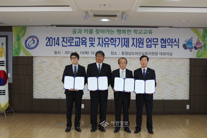 충남 아산교육지원청은 전기안전기술교육원, 아산시 청소년상담복지센터, 아산시 자원봉사센터 등 기관 3곳과 아산교육지원청 대회의실에서 진로교육 및 자유학기제 기반조성 및 활성화를 위한 업무협약을 15일 체결했다. (사진제공=아산교육지원청)