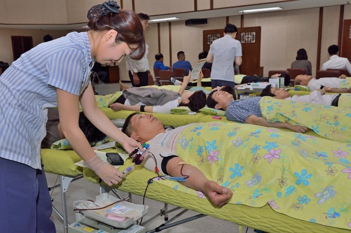 16일 서울 송파구가 구청 4층 대강당에서 지역 사회에 안정적인 혈액수급을 도모하고, 자발적 헌혈 문화 정착에 기여하고자 공무원, 공익근무요원, 구청을 찾은 주민들과 함께 '사랑의 헌혈 운동'을 열었다. 사진은 이날 헌혈에 참여하는 주민들의 모습. (사진제공=송파구청)
