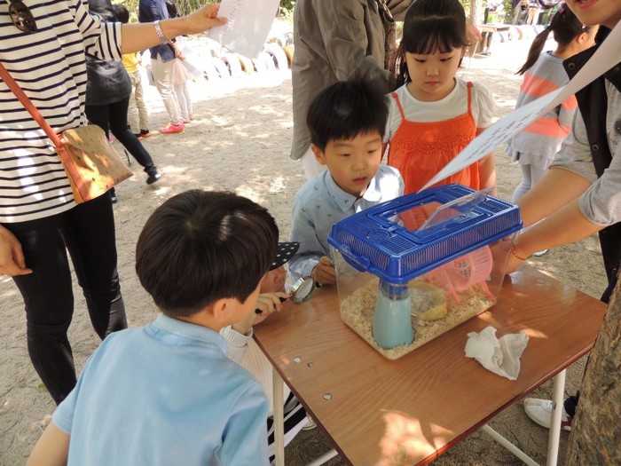 최근 경기 부천시 범박초등학교가 1학년 주제통합수업의 일환으로 '학부모와 함께하는 애완동물 박람회'를 열어 각 가정에서 기르는 장수풍뎅이, 정글리안 햄스터, 사랑 앵무, 넓적다리 사슴벌레, 거북 등 다양한 애완동물을 데려와 전시했다. 사진은 햄스터를 구경하고 있는 아이들의 모습. (사진제공=부천교육지원청)