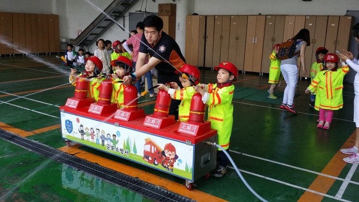 경기 군포소방서는 지난 16일 어린이들에게 발생할 수 있는 각종 안전사고를 예방하고 어린이들의 안전의식을 높이고자 여수룬유치원과 아이숲어린이집 원생 90여명을 대상으로 화재시 대피방법, 물 소화기 장비 체험 등 소방체험교실을 진행했다. (사진제공=군포소방서)