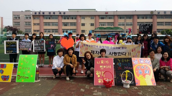 경기 하남시 남한중학교는 지난 15일 스승의 날을 맞아 교장과 선생님들이 학생들에게 사탕과 초콜릿을 나눠주고 교문 앞에서 '제자야 사랑한다'라는 퍼포먼스를 진행했다. 사진은 이날 교문 앞에서 선생님과 '또래상담부 학생'들이 참여한 '제자야 사랑한다' 퍼포먼스 모습. (사진제공=하남시청)