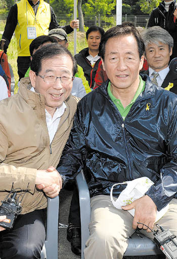 정몽준(오른쪽) 새누리당 서울시장 후보와 박원순 새정치민주연합 서울시장 후보가 18일 오전 서울 은평구 서울시장기 국민생활체육동산대회에 참석해 악수를 나누고 있다.