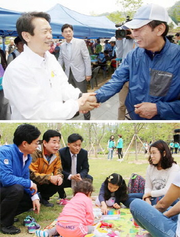 남경필 새누리당 경기도지사 후보가 17일 경기도 수원시 장안구 광교공원에서 열린 수원중·고 총동문회 광교산 등반행사에서 참가자들과 인사를 나누고 있다(위). 김진표 새정치민주연합 경기도지사 후보도 같은 날 수원 광교산을 찾아 시민들과 인사를 나누고 있다.