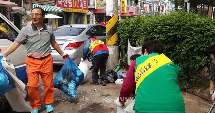 19일 오전 인천광역시 서구 가좌4동 주민센터는 여름 장마철을 대비해 주민자치위원회 등 8개 자생단체 엽합이 각종 쓰레기처리·불법광고물 수거 등 합동 지역 환경정비를 실시했다. 사진은 이날 주택가 골목길을 정비하고 있는 회원들의 모습. (사진제공=인천광역시서구청)