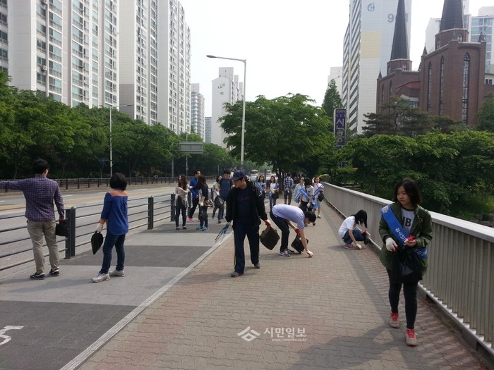 지난 17일 경기 용인시 수지구 풍덕천2동의 동 주민센터 직원들과 신협, 지역 주민 70여명이 '깨끗한 풍덕천2동 만들기' 활동의 일환으로 지역내 신정공원, 수지도서관 일대 등의 취약지역을 중심으로 쓰레기를 수거하는 환경정화활동을 펼쳤다. 사진은 이날 참여자들이 함께 쓰레기를 수거하는 모습. (사진제공=용인시청)