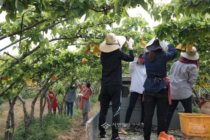 배 과수원 봉지씌우기 봉사 구슬땀