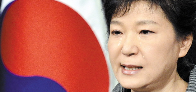 박근혜 대통령이 19일 오전 청와대 춘추관에서 ‘세월호 관련 및 새로운 국가운용 방안에 대한 대국민담화’를 발표하며 눈물을 흘리고 있다. 별도 질의 응답없이 20분간 진행된 대국민담화에서는 박 대통령이 그동안 각계의 의견을 듣고 회의를 거친 끝에 세월호 참사에 대한 대국민사과와 국가안전처 설치를 비롯한 재난대응 시스템 개편과 ‘관피아(관료+마피아)’ 등 공직사회의 적폐(積弊) 청산, 공무원 채용 및 인사 시스템 개편 등의 방안을 발표했다.
