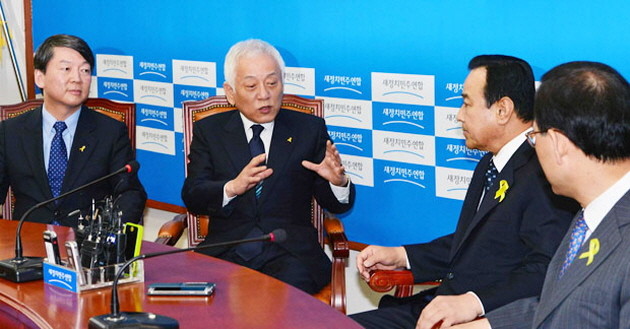 새누리당 이완구 원내대표와 주호영 정책위의장이 19일 오전 서울 여의도 국회 새정치민주연합 대표실을 방문 김한길, 안철수 공동대표와 이야기를 나누고 있다.