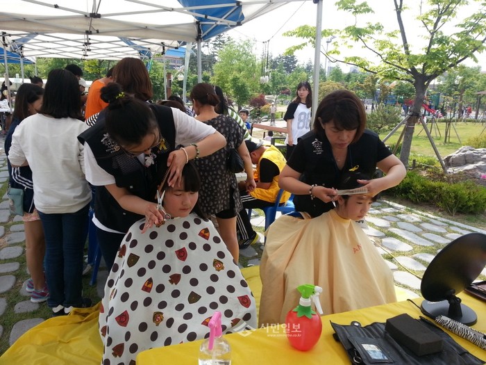 최근 부천시 대명초등학교 학부모회가 부천 오정대공원에서 체험마당·나눔마당·문화마당 등으로 진행된 '문화나눔 한마당'에 참여해 '앞머리 헤어컷' 부스를 운영했다. 사진은 이날 부스를 방문한 학생들의 머리카락을 다듬고있는 학부모들의 모습. (사진제공=부천교육지원청)