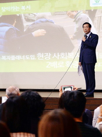 20일 오전 박원순 새정치민주연합 서울시장 후보가 동작구 대방동 서울여성프라자에서 열린 ‘서울시장 후보자 정책토론회’에 참석해 공약을 발표하고 있다.