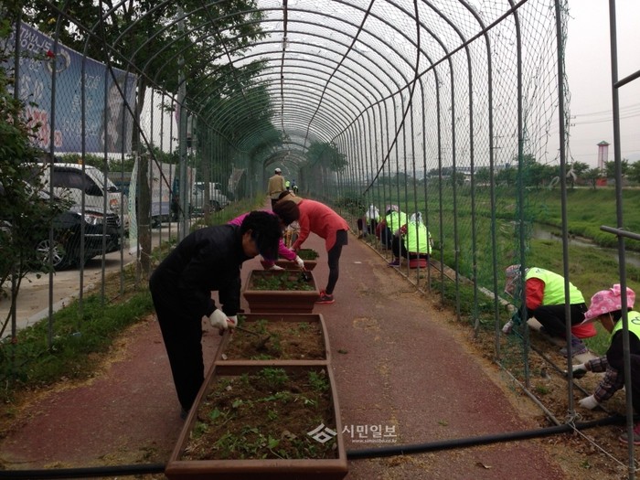 경기 안성시 죽산면 주민자치위원회는 지난 20일 죽산면 주민자치위원 20여명 및 면 사무소 직원과 함께 죽산면 공영주차창 인근에서 조롱박터널 조성을 위한 '조롱박 심기 자원봉사' 행사를 갖고 조롱박 외 6종의 모종 800포기를 심었다. (사진제공=안성시청)