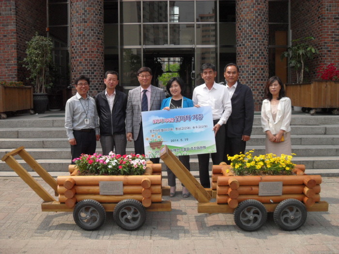 경기 포천시 '2015 경기도체전 소홀읍 추진위원회'는 최근 지역내에 위치한 동남·송우고등학교, 포천아트밸리에 방문해 지역 환경을 개선하기 위한 꽃마차 총 7대를 전달했다. 사진은 이날 꽃마차 두 대를 전달받은 동남고등학교 관계자와 소홀읍 추진위원장 및 관계자의 모습. (사진제공=포천시청)