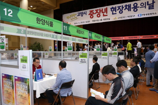 지난 21일 경기 고양시는 덕양구와 함께 구청 대회의실에서 취업난과 구인난 해소를 위해 32개 업체, 1000여명 이상의 구직자가 방문한 가운데 '덕양구와 함께하는 고양시 중장년 현장채용의 날' 취업박람회를 개최했다. (사진제공=덕양구청)