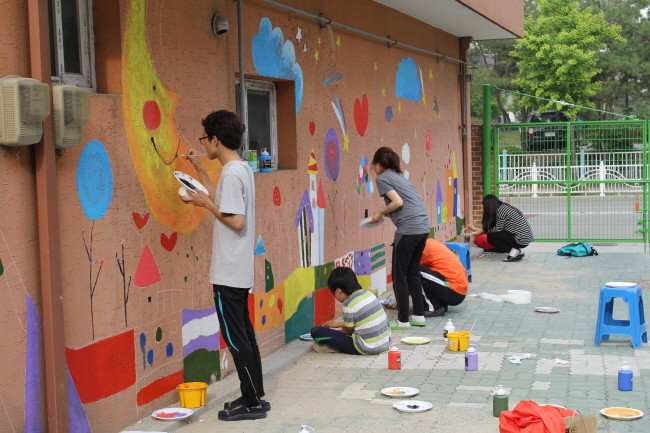 경기 동두천시 사동초등학교는 최근 봄을 맞아 학교 새단장을 위해 예능부를 중심으로 한 재학생들과 교장을 비롯한 교직원들이 '벽화 그리기 활동'을 펼쳤다. 사진은 학생들이 직접 참여한 벽화 그리기 활동 모습. (사진제공=동두천시청)