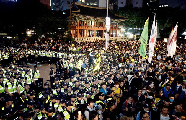24일 오후 서울 종각 인근에서 세월호 참사 2차 범국민촛불 행동 ‘천만의 약속’에 참가한 시민들이 경찰과 대치하고 있다.