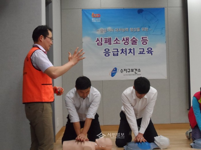경기 용인시 수지구 보건소는 지난 26일 학교 보건교사와 공동주택의 자동제세동기 관리책임자, 일반 시민들을 대상으로 응급상황 발생시 즉각적인 심폐소생술을 할 수 있도록 해당 분야 전문가가 나서 심폐소생술 이론과 실습을 병행하는 응급처치 교육을 실시했다. (사진제공=용인시청)