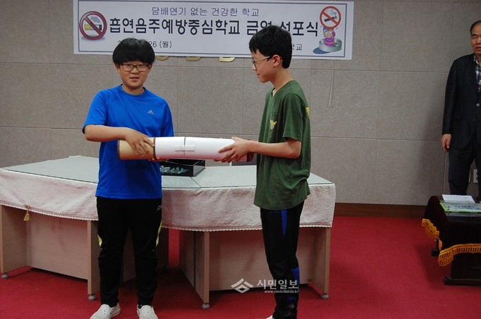 지난 26일 경기 부천시 상동초등학교가 '금연의 날(6월26일)'을 맞아 아침방송조회를 통해 '담배연기 없는 건강한 학교'를 만들기 위한 흡연음주 예방 중심학교 금연선포식을 시행했다. 사진은 이날 선포식에서 대형담배모형을 절단하며 금연을 선언하는 학생들의 모습. (사진제공=부천교육지원청)
