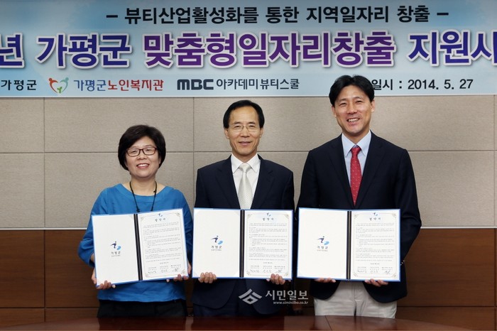 경기 가평군은 27일 군청 소회의실에서 가평군 노인복지관, MBC 아카데미 뷰티스쿨과 함께 지역내 뷰티산업 활성화 및 지역맞춤화 사업을 통한 일자리 창출을 위해 '지역맞춤화 지원사업' 협약을 맺었다. 사진은 이날 협약식에 참석한 최민성 가평군수대행(가운데)과 양순분 가평노인복지회관 관장(왼쪽), 송대림 MBC 아카데미 뷰티스쿨 상무(오른쪽)의 모습. (사진제공=가평군청)