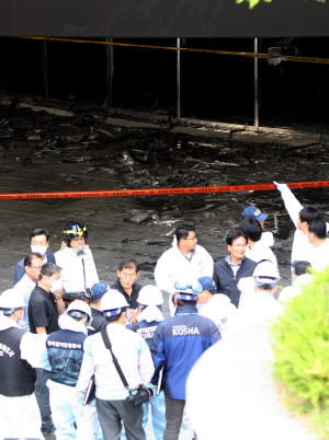 27일 오전 경기 고양시 일산동구 고양종합터미널 지하 1층 화재 현장에서 경찰과 국과수 직원, 가스안전공사 관계자들이 현장 감식을 위해 진입을 준비하고 있다.