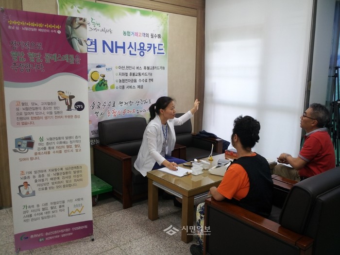 충남 아산시보건소는 지난 26일 온양농협 터미널지점에서 지역주민을 대상으로 심·뇌혈관 질환 예방을 위해 혈압, 혈당, 콜레스테롤 측정과 상담을 제공하는 '심·뇌혈관 질환 이동 상담실'을 운영했다. 사진은 이날 이동 상담실을 방문한 주민들의 모습. (사진제공=아산시청)