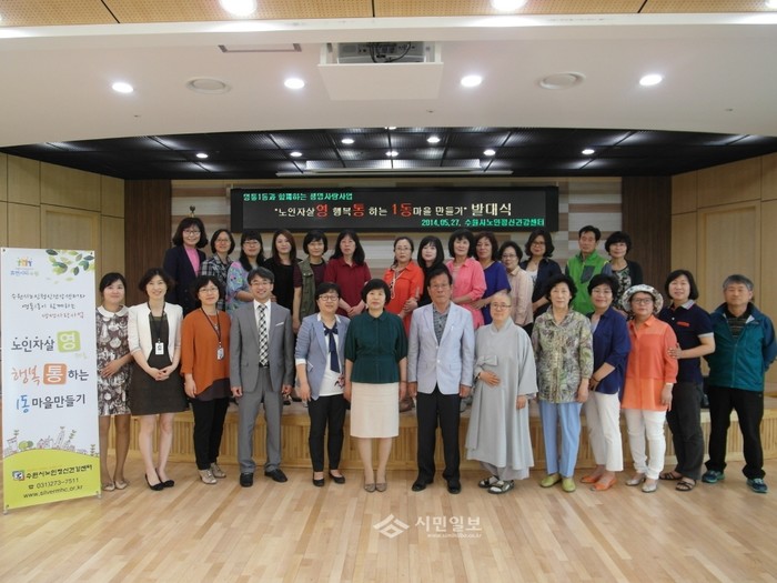 경기 수원시 노인정신건강센터는 지난 27일 영통구 보건소장 등 관계자 및 주민 30여명이 참석한 가운데 노인 자살예방을 위한 '노인 자살 영, 행복 통하는 1동 마을 만들기' 봉사대 발대식을 열고 영통1동 통장들을 전문자원봉사자로 위촉했다. (사진제공=수원시청)