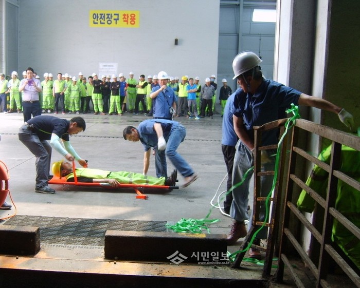 최근 서울 송파구가 각종 안전사고 발생에 대한 환경미화원의 초동대처 능력을 강화하기 위해 미화원 전원을 대상으로 장지동 자원순환공원에서 '재난대비 훈련'을 실시했다. 사진은 이날 재난발생 상황을 가정해 직접 훈련하는 미화원들의 모습. (사진제공=송파구청)