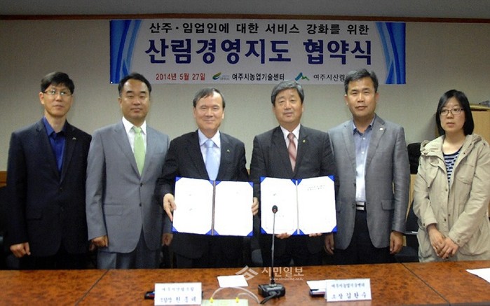 지난 27일 경기 여주시 농업기술센터는 여주시 산림조합과 농업기술센터 화상 회의실에서 산주·임업인에 대한 서비스 강화로 산림소득원 증대 및 지역경제 활성화를 위한 '경영지도 협약서'를 체결했다. 사진은 이날 협약을 맺은 김완수 농업기술센터 소장과 원종태 산림조합장의 모습. (사진제공=여주시청)