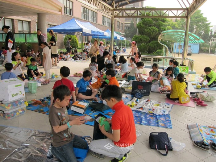 최근 경기 부천 상도초등학교가 학생들이 재활용을 통한 물자 절약과 불우이웃돕기를 직접 실천 해보도록 하기 위해 각 가정에서 중고 물품을 손질해 가져와 직접 판매하고 수익금을 기증하는 '불우이웃돕기 알뜰 경제 체험 장터'를 열었다. 사진은 이날 참여한 학생들이 직접 물건을 사고파는 모습. (사진제공=경기도부천교육지원청)