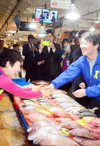 안철수 새정치민주연합 공동대표가 28일 오후 부산 동래구 동래시장을 방문, 상인과 인사하며 6.4지방선거 후보의 지지를 호소하고 있다.