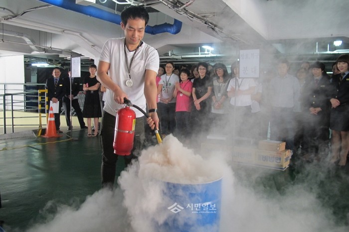경기 군포소방서는 29일 군포시 산본역에 위치한 뉴코아 아울렛 산본점에서 관계자 100여명을 대상으로 화재 초기 대피 및 대응 교육훈련을 실시했다. 이날 훈련은 뉴코아 매장내 대피 훈련과 주차장에서 종류별 소화기 사용법 및 주의사항을 교육받는 시간으로 진행됐다. (사진제공=군포소방서)