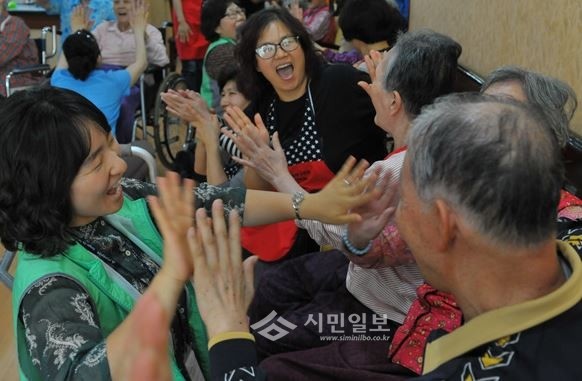 최근 서울 송파구 자원봉사센터 베이비부머 A+봉사단이 삼전동에 위치한 시립 송파 노인전문 요양원을 방문해 말동무가 돼주고, 재능나눔 공연을 펼치는 등 다양한 프로그램을 진행했다. 사진은 이날 웃음치료 프로그램을 진행하는 봉사단과 노인들의 모습. (사진제공=송파구청)