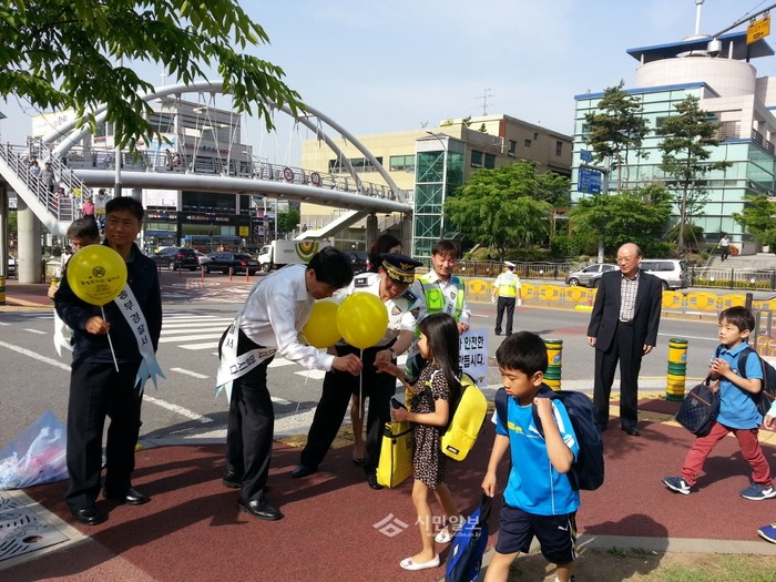 경기 용인동부경찰서 교통관리계는 석현초등학교 앞에서 등하굣길 어린이 교통안전을 위해 녹색어머니회와 합동으로 무단횡단 금지, 스쿨존내 안전운행 등의 내용이 담긴 리플릿과 홍보물품을 나눠주는 등 어린이 교통사고 예방을 위한 '어린이 교통안전 캠페인'을 실시했다. (사진제공=용인동부경찰서)