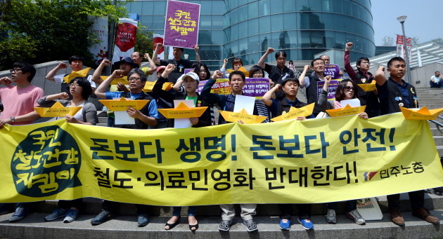 민주노총 서울본부 관계자들이 29일 오전 서울 용산구 동자동 서울역광장에서 '국민철도·국민건강 서울지킴이 발대식'을 하고 있다. 이들은 "이번 참사가 이윤만을 위해 안전규제를 완화하고 공공서비스를 민영화하는 정부의 정책 속에서 비롯됐다"며 "철도와 의료에 대한 민영화를 막기 위해 범국민적인 지지 여론을 형성할 수 있도록 노력하겠다"고 전했다.
