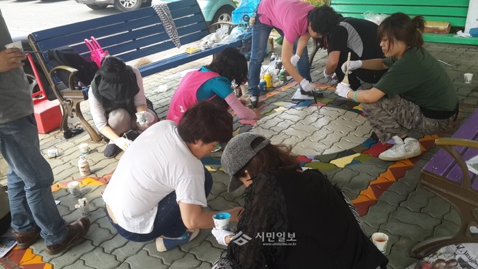 경기 이천시 증포동 주민자치위원회는 최근 마을 만들기 사업추진의 일환으로 증포동 평생학습 프로그램 야외스케치 수강생들과 함께 증포동 주민센터의 쉼터인 사각정을 대상으로 새단장 작업을 실시했다. 사진은 참가자들이 가로 2m, 세로 1m 상당의 트릭아트를 그리는 모습. (사진제공=이천시청)