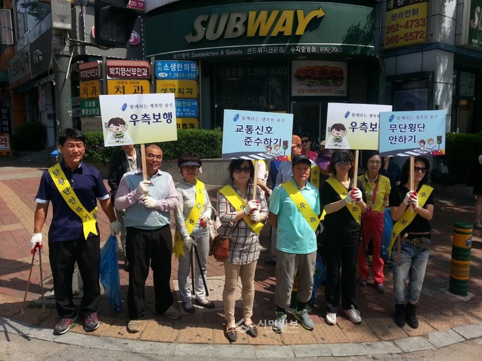 지난 5월30일 경기 용인시 수지구 풍덕천1동 주민센터는 보행자 통행이 평소 많은 수지 중심상가 일원에서 풍덕천1동 통장협의회, 새마을회, 청소년 지도위원회 등 지역내 유관단체들과 함께 보행자들과 운전자를 대상으로 교통신호 준수 등 ‘보행안전 캠페인’을 실시했다. (사진제공=용인시청)