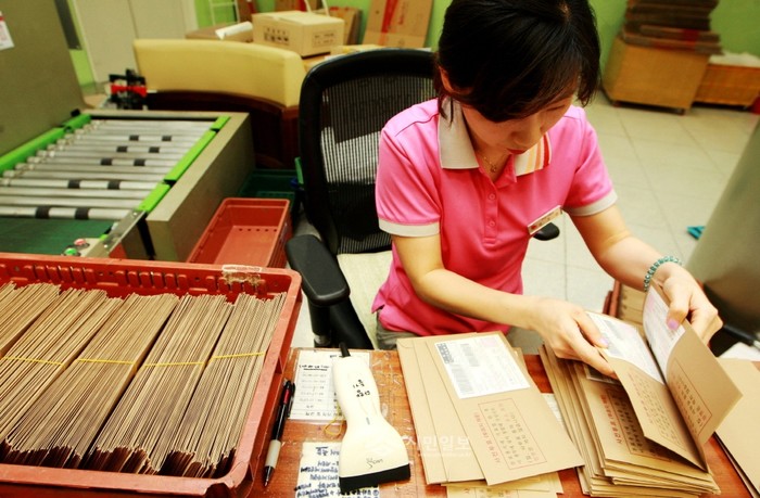6.4 지방선거 사전투표가 시작된 30일 오후 서울중앙우체국 직원들이 중구선거관리위원회에서 인수한 사전투표회송우편물을 접수하고 있다. 우체국은 사전투표 마지막 날인 31일까지 사전투표회송우편물을 접수해 2일까지 해당 선거관리위원회로 배달한다.