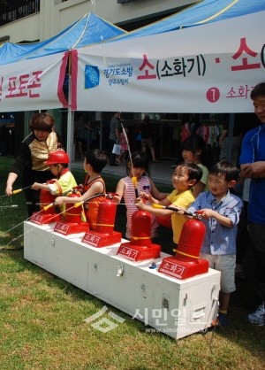 지난 5월30일 경기 양주시 양주소방서가 덕계동 V플러스 3층 잔디광장에서 어린이 및 학부모 200명을 대상으로 '소소심 119특별이벤트 및 불조심 어린이 그림대회'를 개최했다. 사진은 이날 행사에 참여한 어린이들이 체험부스에서 물소화기 사용법을 배우고 있는 모습.(사진제공=양주소방서)