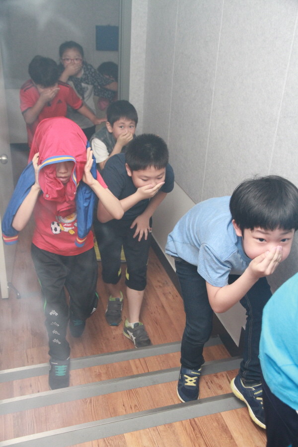 지난 3일 서울 구로구 구로소방서가 구 소재 개봉초등학교 3학년생 35명을 서 3층 소방안전체험교실로 초청해 '우리 동네 보물찾기' 답사프로그램을 진행했다. 사진은 이날 대피훈련을 받는 학생들의 모습. (사진제공= 구로소방서)