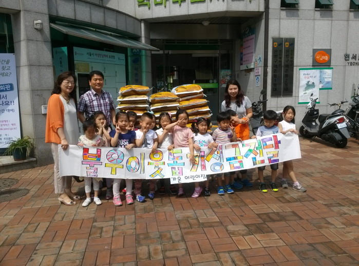최근 서울 은평구 역촌동 가온어린이집에서 저소득 조손가정을 돕기 위해 지난 5월 말 실시한 ‘아나바다 시장놀이’에서 얻은 수익금으로 역촌동 소재 저소득 조손가정 20가구에 각각 쌀 20kg을 후원했다. 사진은 가온어린이집 어린이들과 선생님들이 쌀 후원 후 기념촬영을 하는 모습. (사진제공=은평구청)
